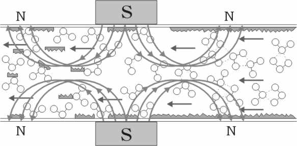 水是导体,当水流经一适当聚集的磁场时,将产生一个电动势,这个电动势将使水带上直流正电荷而互相排拆、分离,这导致水的表面张力大大降低,从而使水具有溶解性,这样水能溶解更多的可溶解性物质,起到防垢的