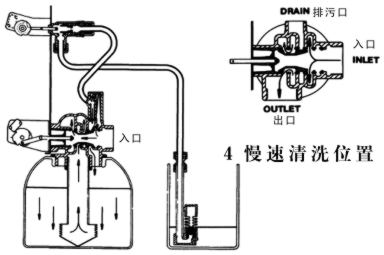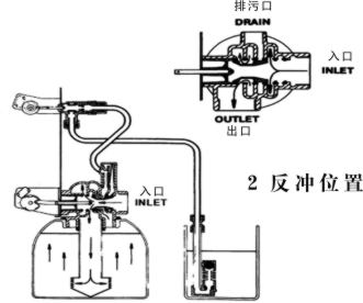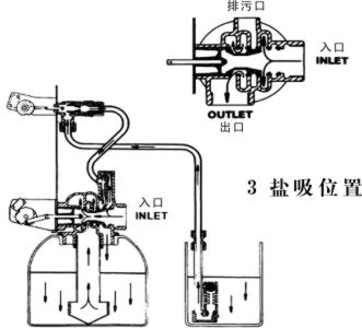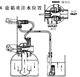 硬水从入口进入控制阀,部分硬水经下部活塞槽,射流器喉管,吸盐阀及吸盐限流垫圈,注入盐箱。其全硬水经下部活塞槽至罐