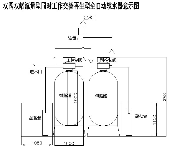 1. 将软水器控制阀手动转至工作位置,打开进出水口,使水流入树脂罐。直到管路内空气排尽,当水流流出出水口时,关闭进出水